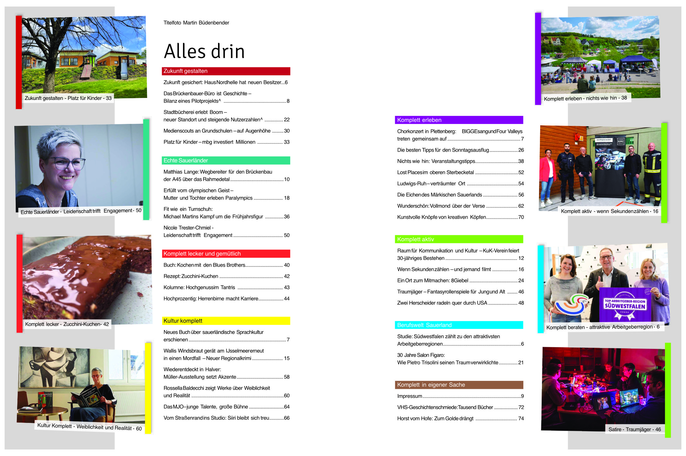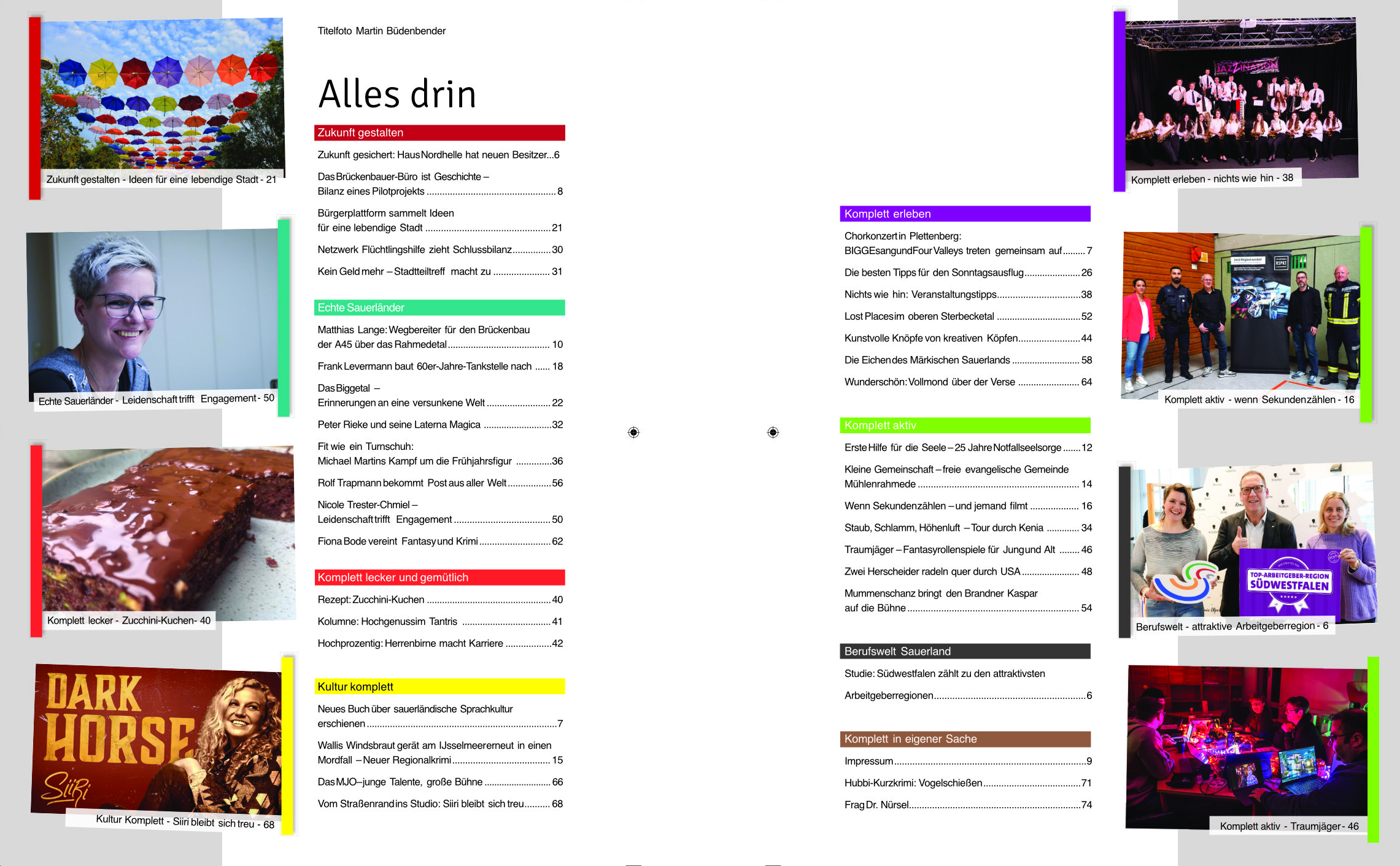 Komplett ist das gedruckte Sauerlandmagazin und erscheint in zwei verschiedenen Ausgaben in den Regionen zwischen Verse und Sorpe sowie zwischen Volme und Lister.
