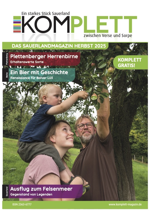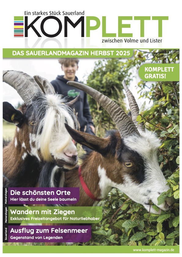 Die Herbstausgaben von Komplett – Das Sauerlandmagazin erscheinen im September 2025. Darin lesen Sie über attraktive Ausflugsziele, interessante Menschen und Initiativen in den kompletten Regionen zwischen Volme und Lister sowie zwischen Verse und Sorpe.